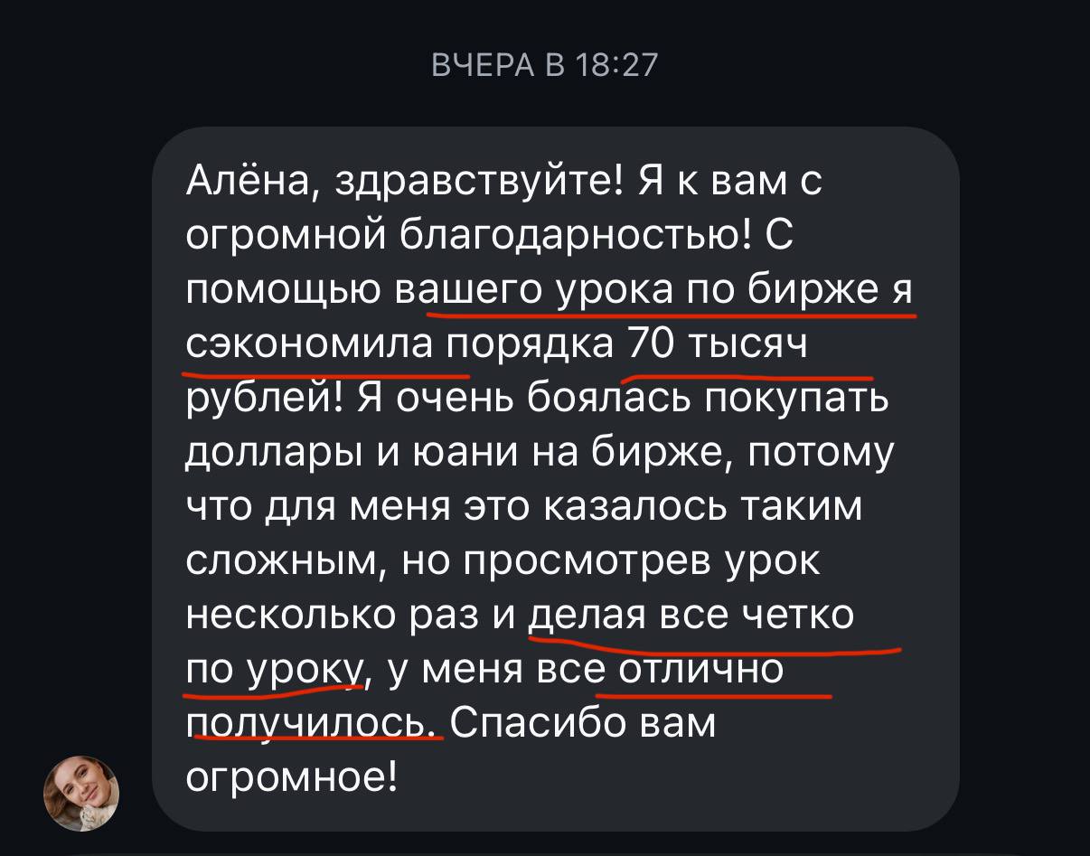 Алёна, здравствуйте! Я к вам с огромной благодарностью! С помощью вашего урока по бирже я сэкономила порядка 70 тысяч рублей! Я очень боялась покупать доллары и юани на бирже, потому что для меня это казалось таким сложным, но просмотрев урок несколько раз и делая все четко по уроку, у меня все отлично получилось. Спасибо вам огромное!