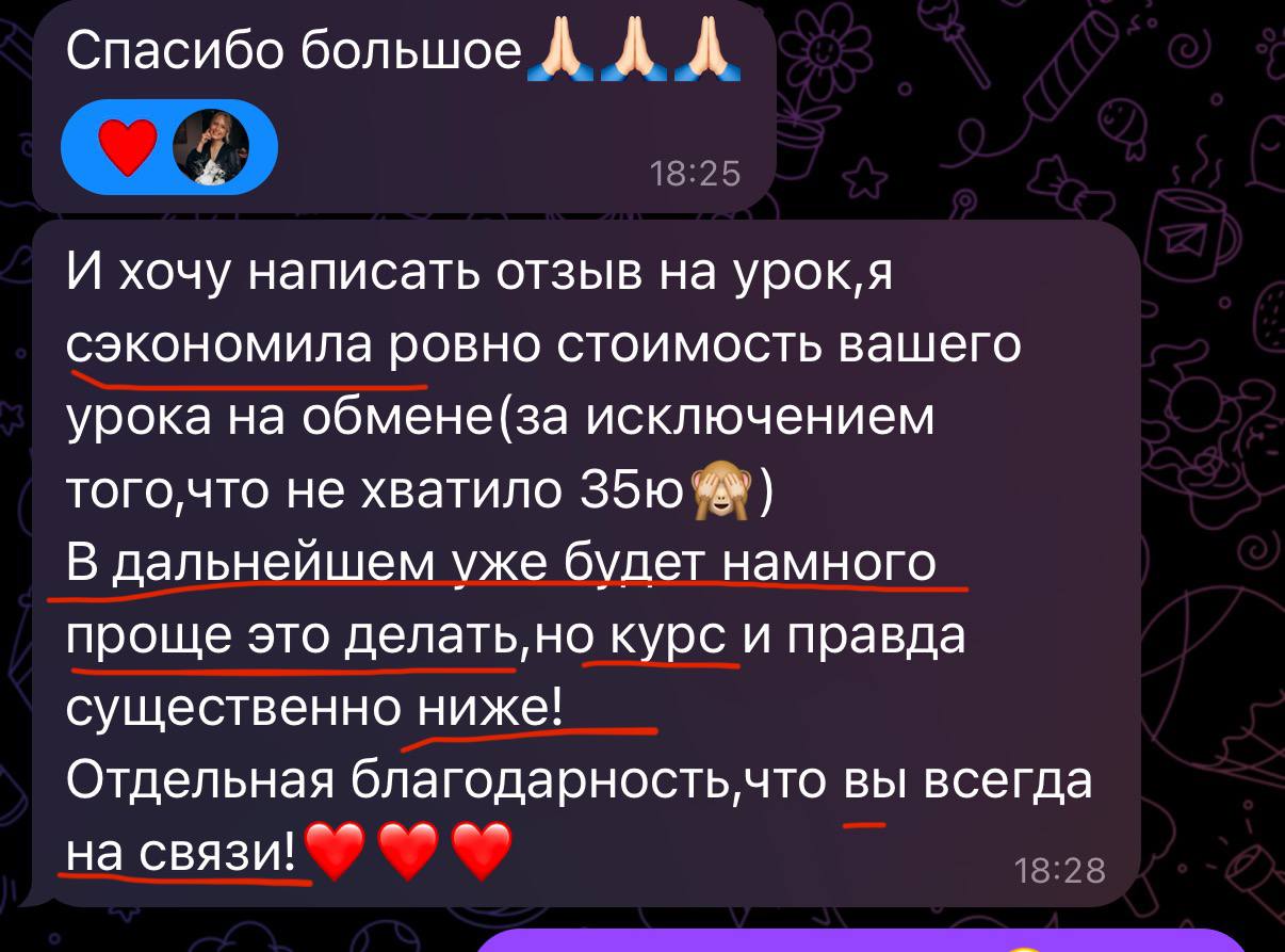 Спасибо большое🙏 И хочу написать отзыв на урок, я сэкономила ровно стоимость вашего урока на обмене(за исключением того, что не хватило 35ю 🙈В дальнейшем уже будет намного проще это делать, но курс и правда существенно ниже! Отдельная благодарность, что вы всегда на связи!❤️❤️❤️