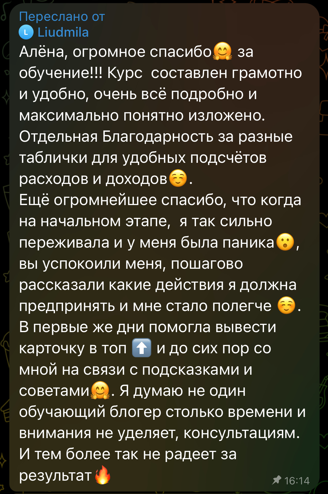 Алёна, огромное спасибо🤗 за обучение!!! Курс составлен грамотно и удобно, очень всё подробно и максимально понятно изложено. Отдельная Благодарность за разные таблички для удобных подсчётов расходов и доходов☺. Ещё огромнейшее спасибо, что когда на начальном этапе, я так сильно переживала и у меня была паника😮, вы успокоили меня, пошагово рассказали какие действия я должна предпринять и мне стало полегче ☺. В первые же дни помогла вывести карточку в топ ⬆ и до сих пор со мной на связи с подсказками и советами🤗. Я думаю не один обучающий блогер столько времени и внимания не уделяет, консультациям. И тем более так не радеет за результат🔥