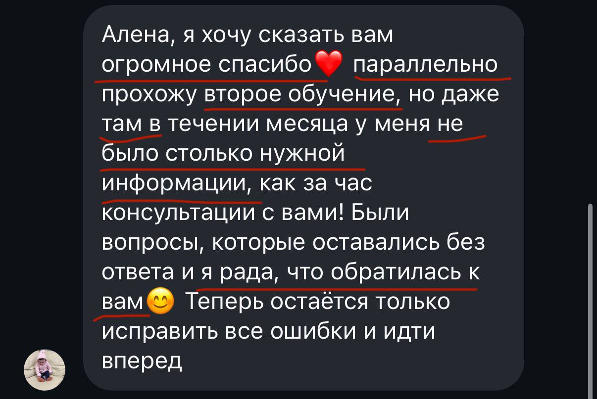 Алена, я хочу сказать вам огромное спасибо ❤ параллельно прохожу второе обучение, но даже там в течении месяца у меня не было столько нужной информации, как за час консультации с вами! Были вопросы, которые оставались без ответа и я рада, что обратилась к вам☺ Теперь остаётся только исправить все ошибки и идти вперед.