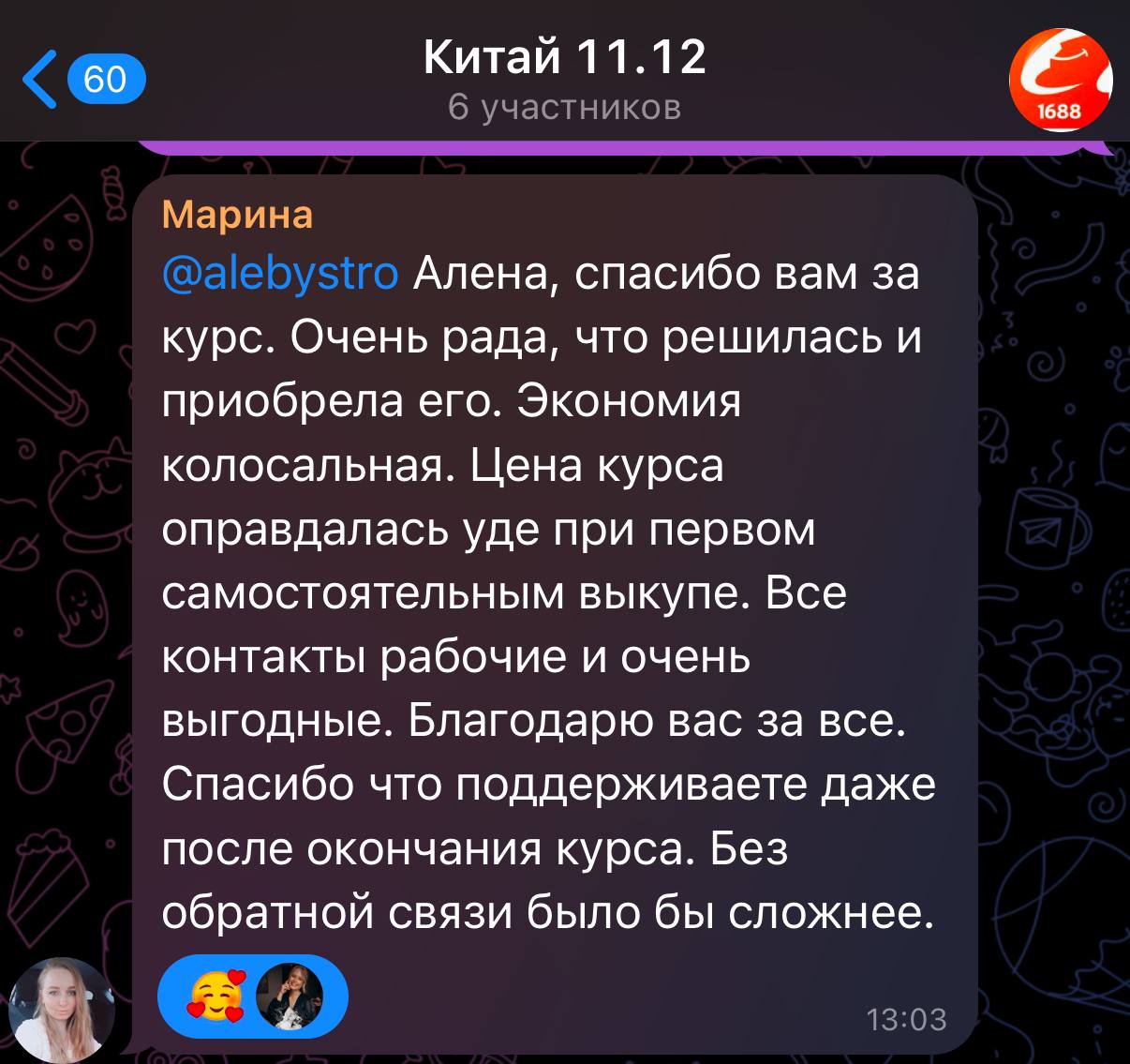 @alebystro Алена, спасибо вам за курс. Очень рада, что решилась и приобрела его. Экономия колосальная. Цена курса оправдалась уде при первом самостоятельным выкупе. Все контакты рабочие и очень выгодные. Благодарю вас за все. Спасибо что поддерживаете даже после окончания курса. Без обратной связи было бы сложнее.