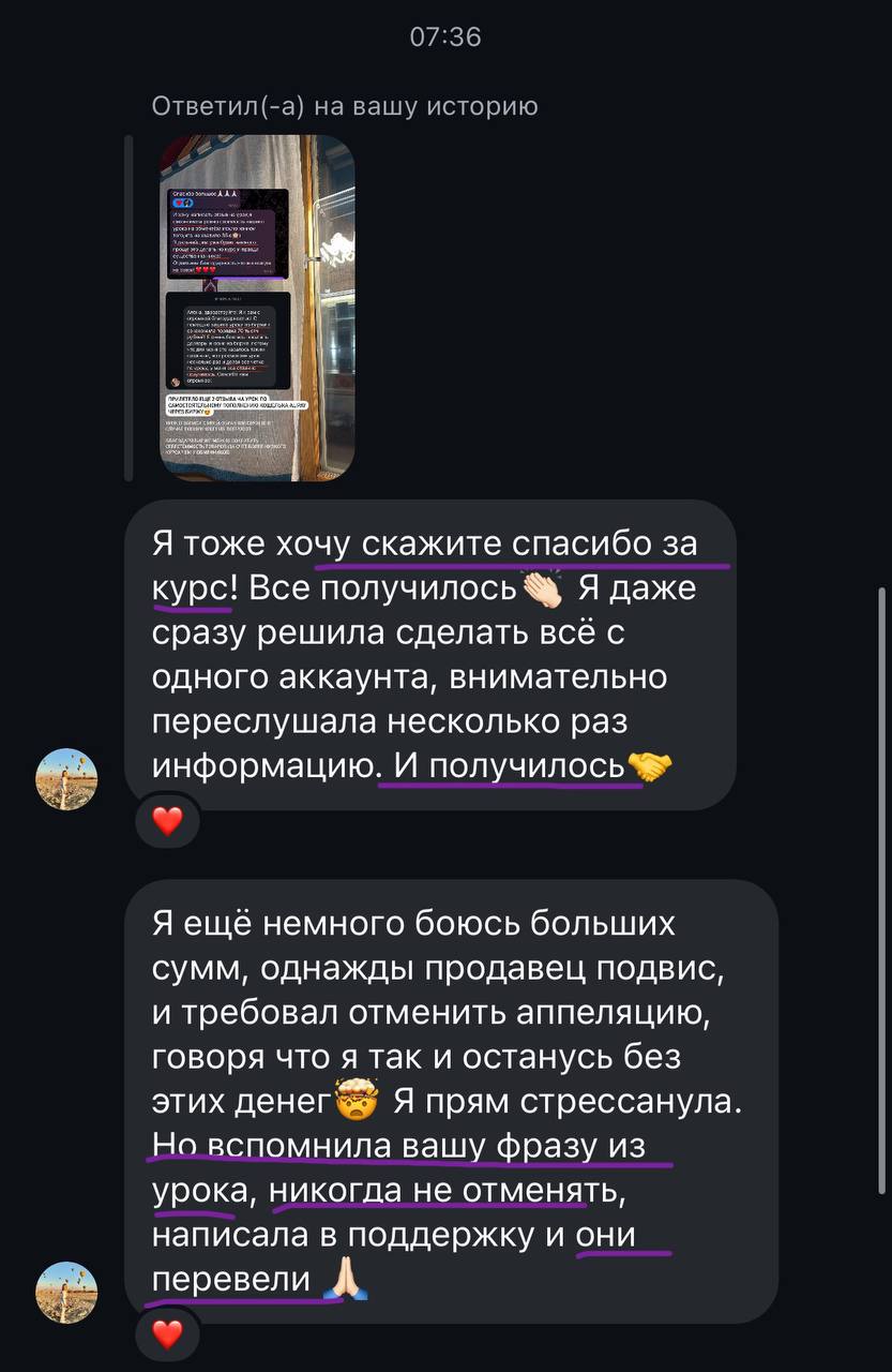 Я тоже хочу сказать спасибо за курс! Все получилось 👏Я даже сразу решила сделать всё с одного аккаунта, внимательно переслушала несколько раз информацию. И получилось 🤝 Я ещё немного боюсь больших сумм, однажды продавец подвис, и требовал отменить аппеляцию, говоря что я так и останусь без этих денег🤯Я прям стрессанула. Но вспомнила вашу фразу из урока, никогда не отменять, написала в поддержку и они перевели 🙏